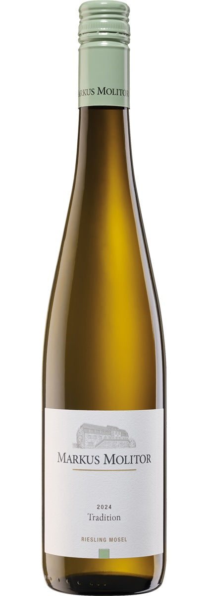 Nach der Lese im Oktober wurden die Trauben gemahlen und kurz auf den Beerenhäuten mazeriert, um die Aromen und Mineralien zu lösen. Bei der kühlen und langsamen Spontanvergärung konnten sich das feine und elegante Bukett sowie die schieferartigen Aromen voll entfalten. Die Steinobstaromen sind sehr fein ausgeprägt. Dieser weiche, saftige und sehr üppige Riesling zeigt eine seidige Textur und eine präzise Säure. Dennoch schmeckt er sehr ausgewogen - trotz seiner Jugend. Molitor TRADITION weist ein enormes Alterungspotential auf.