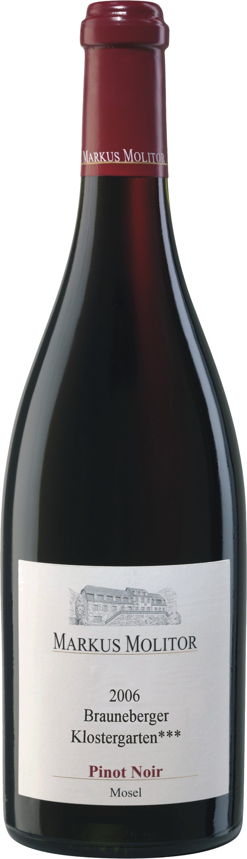 Der Brauneberger Klostergarten ist eine sehr gemischte Lage mit zwei steilen und zwei hängigen Parzellen mit feinsplittrigem Schiefer und guter Feinerd-Auflage. Wasser wird gut gespeichert und zusammen mit Mineralien aus dem Boden an die Reben abgegeben, dadurch entstehen Trauben mit hohem zuckerfreiem Extrakt. Daraus macht Markus Molitor durch seine schonende und behutsame Weiterverarbeitung einen hochkonzentrierten, schiefergeprägten Rotwein, den er anschließend 15 Monate in französischen Barriques reifen lässt.