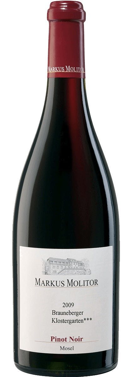 Der Brauneberger Klostergarten ist eine sehr gemischte Lage mit zwei steilen und zwei hängigen Parzellen mit feinsplittrigem Schiefer und guter Feinerd-Auflage. Wasser wird gut gespeichert und zusammen mit Mineralien aus dem Boden an die Reben abgegeben, dadurch entstehen Trauben mit hohem zuckerfreiem Extrakt. Daraus macht Markus Molitor durch seine schonende und behutsame Weiterverarbeitung einen hochkonzentrierten, schiefergeprägten Rotwein, den er anschließend 15 Monate in französischen Barriques reifen lässt.